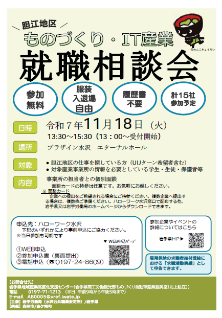 ■開催日時:11月18日(火) 13:30~15:30 ■参加企業:岩手県のホームページに掲載されています (1)WEB申込はこちらから 申込締切:11月12日(水) 23:59 申込書や面談カードは岩手県のホームページに掲載されています。  |