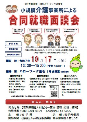 岩手県社会福祉協議会では、小規模介護事業所による合同就職面談会を開催します。地元に根差した小規模事業所の情報が一度に収集できます。介護の仕事に関心のある方、ライフスタイルにあった職場を希望する方、資格・経験のない方もお気軽に参加ください。