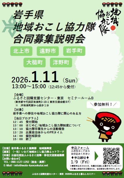 岩手県では、地域おこし協力隊への応募を希望する方に対して、協力隊を募集している岩手県内市町村の魅力や目的を伝え、地域おこし協力隊の活動内容や意義を理解してもらうと同時に、地域に対して興味を持ち、現役隊員や担当者との交流を通じて、実際に協力隊として活動するイメージを感じてもらい、応募してもらうことを目的として、「岩手県地域おこし協力隊合同募集説明会」を開催します。