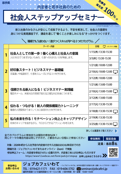 ジョブカフェいわて または オンライン(Zoom)で実施 |