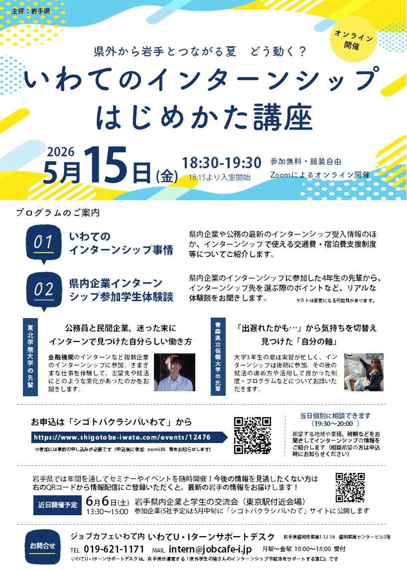 今年の夏休みに岩手の企業でインターンシップしたいと考えているけど、どんな企業やプログラムがあるのか知りたい方や、就活スタートに向けて岩手で就活した先輩の話を聞いてみたい方、この講座で岩手県内の夏インターンシップ受入情報や就活情報をまるごとお伝えします!