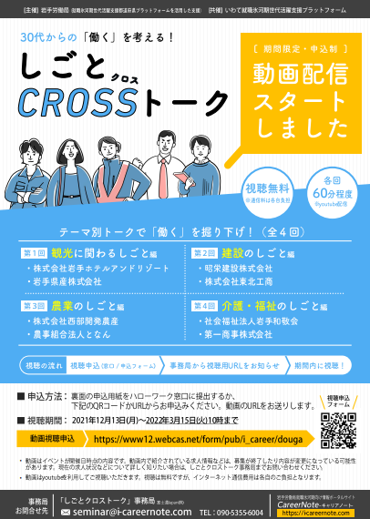 ・観光に関わるしごと(11月30日開催分) ・建設業のしごと(12月9日開催分) ・農業のしごと(12月22日開催分) ・介護・福祉のしごと(1月18日開催分) |